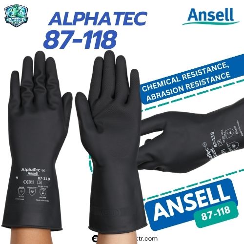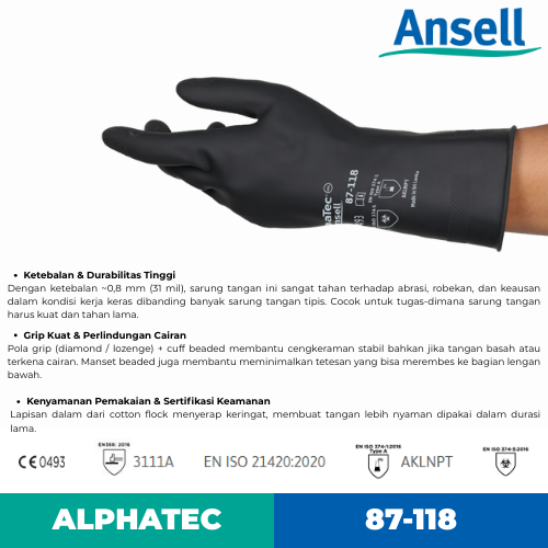 Nama / Seri Produk Ansell AlphaTec® 87-118 sarung tangan lateks berat (natural rubber latex, heavy-duty)